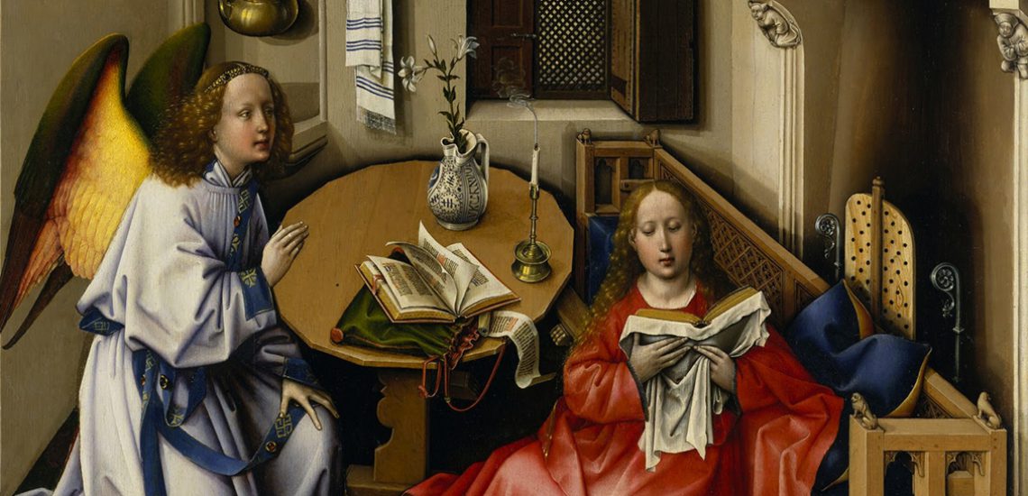 Maria schaut den Engel nicht an. Hat sie ihn noch gar nicht bemerkt oder spricht der göttliche Bote durch das Buch zu ihr?